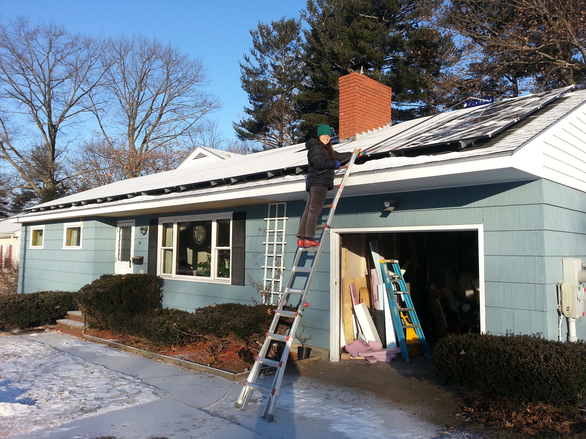 So I woke up Saturday morning to a bright sunny day looking forward to spinning our electric meter backwards, a rare occasion this time of year. I looked out the window and was discouraged to see that we had received a light dusting of snow Friday night, only about an inch or so but that’s plenty to totally shut down the power plant on the roof. Not to worry though, Li Ling the Fearless, was on the job!