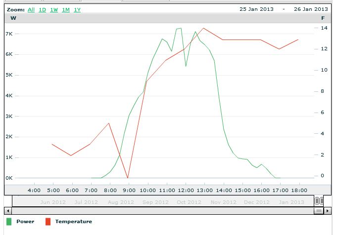 January 26, 2013; Solar power output in Watts on left scale, temperatures on right