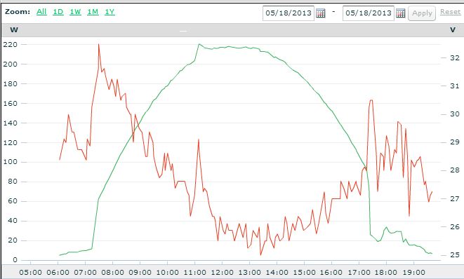 You can see, there is a voltage spike that corresponds to power spike just after the 11am cleaning. The highest voltage readings are first thing in the morning as the sun is just coming up and the panels are nice and cool. Then the voltage drops off all day as ambient and cell temperatures climb. Then at the end of the day, the sun went behind the trees and power dropped off but the voltage spiked again.