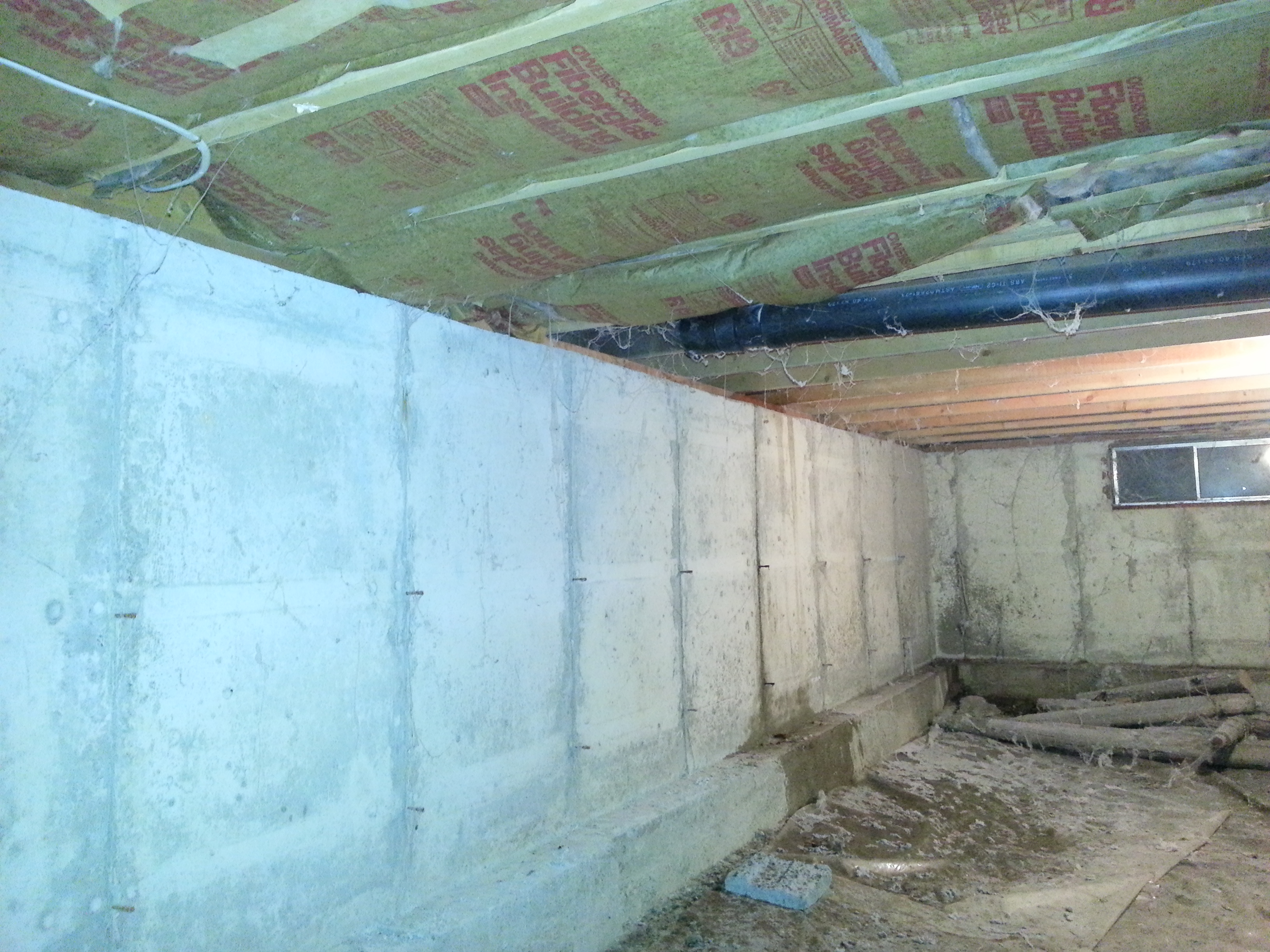 Original condition: the insulation was located in the floor of the bedroom. That left the basement wall exposed to a cold crawlspace and the plumbing mostly unprotected.