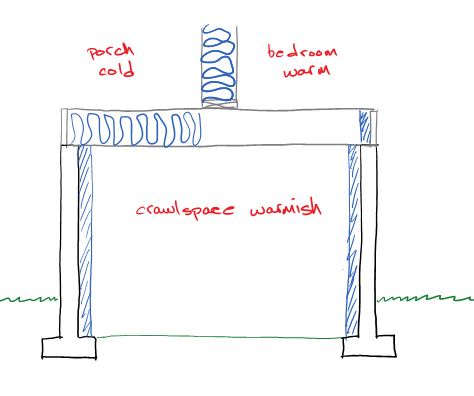 This strategy had the strange outcome that I removed the fiberglass insulation from the bedroom floor and put it in the floor of the porch, with some additional foam board insulation underneath. The walls between the crawlspace and the outdoors are insulated, everything else is adjacent to spaces that are inside the house, with the exception of the porch, therefore the porch floor gets insulated. I started with the intention of building a wall between the part of the crawlspace under the bedroom and the part under the porch so I wouldn’t have to insulate the porch floor. But I quickly abandoned that after puzzling through how to build that wall. And by doing so I avoided having to insulate the wall between the basement and the space under the porch.