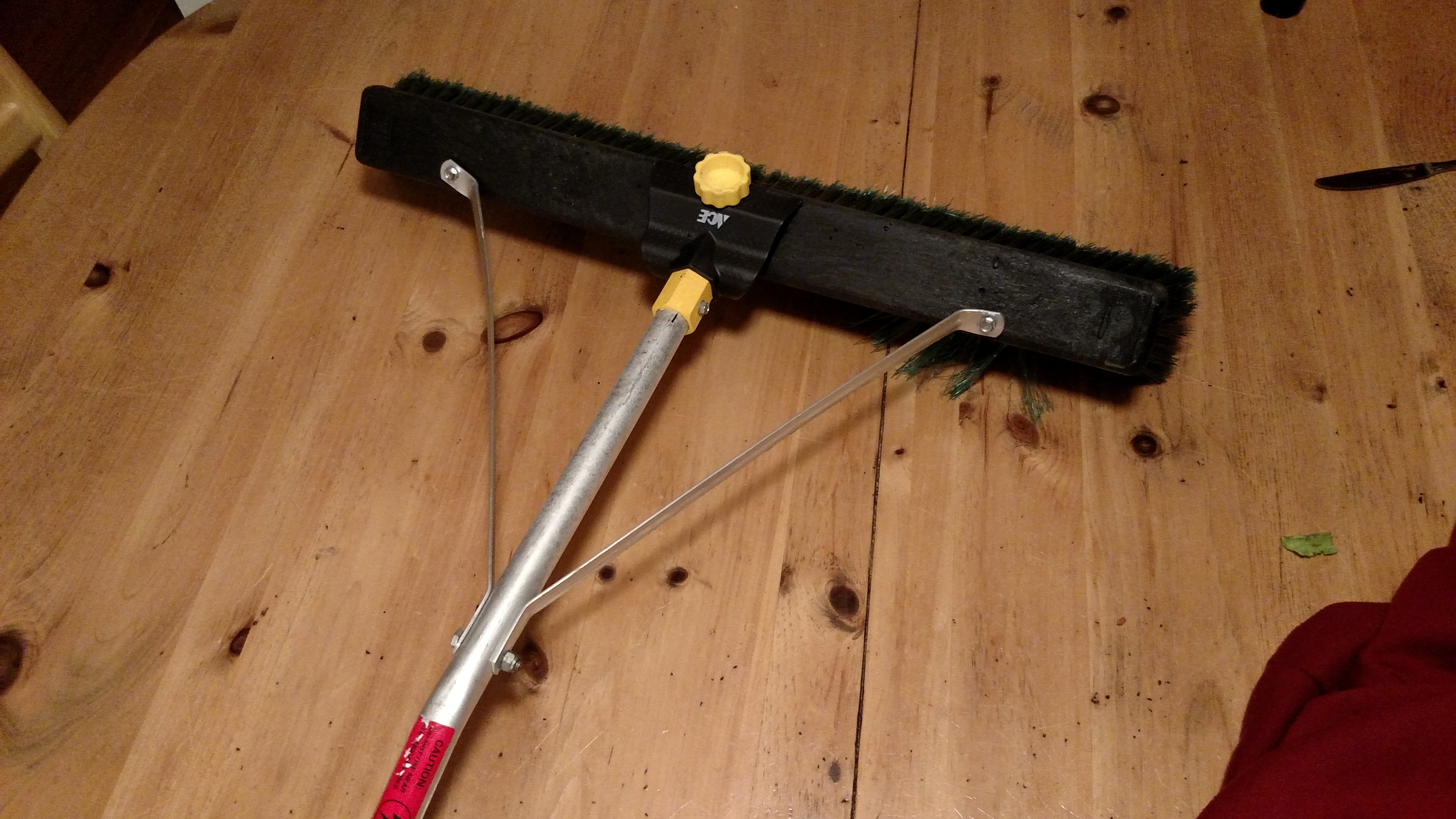 My first winter here I used a plastic roof rake. It works OK but the edge sometimes get caught on the bolt heads that stick up above the solar panels. So last winter I upgraded to a hybrid pushbroom contraption. A client of mine came up with this design. The telescoping handle from the plastic roof rake gets bolted onto the pushbroom head. Here are the steps: